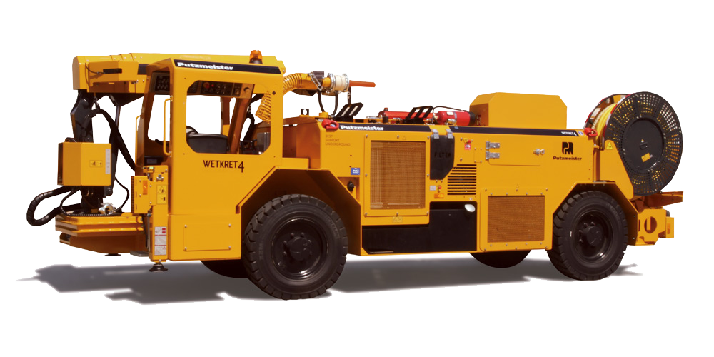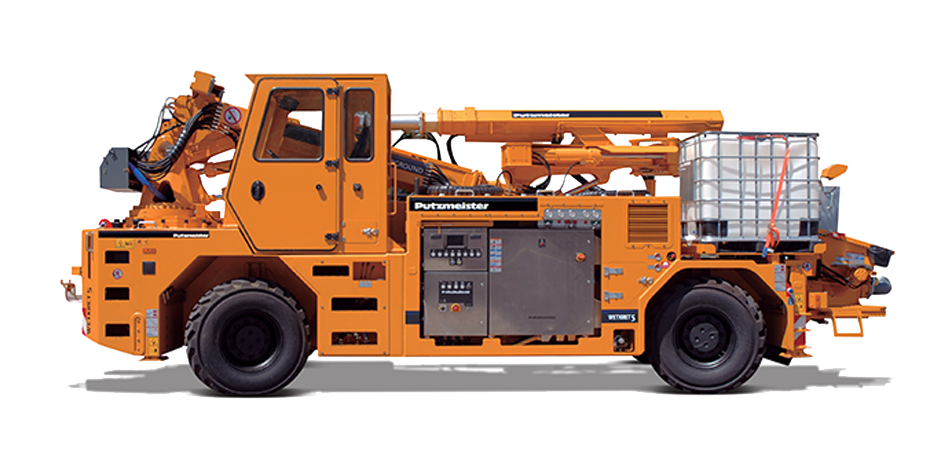 Ideal for mining galleries, thanks to its its heavy-duty chassis, Putzmeister's concrete pump and synchronized additive system